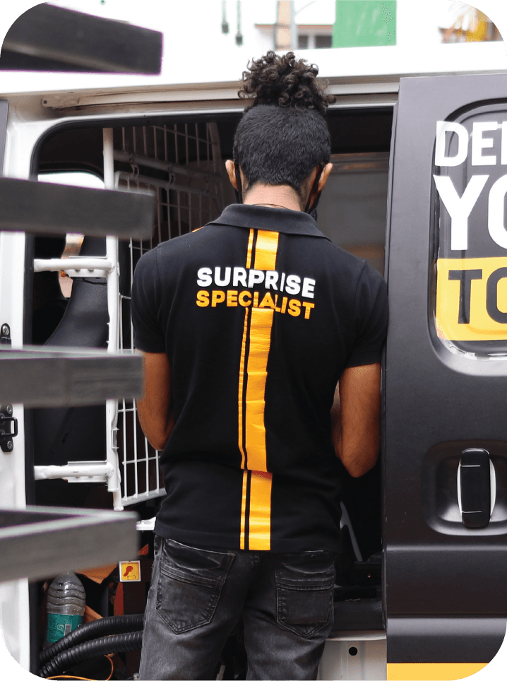 Not a delivery guy. A trained Surprise Specialist who guides the moment and hosts it emotionally.